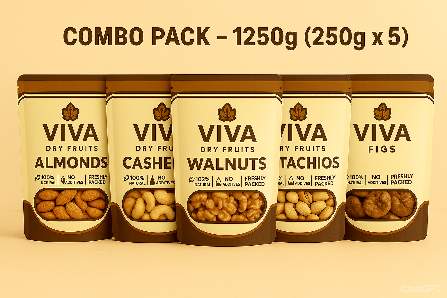 π₯ Limited Time Combo Offer β Get the VIVA Premium Dry Fruits Combo Pack (1250g), specially curated with 5 of the most loved dry fruits for your daily health and energy needs.
